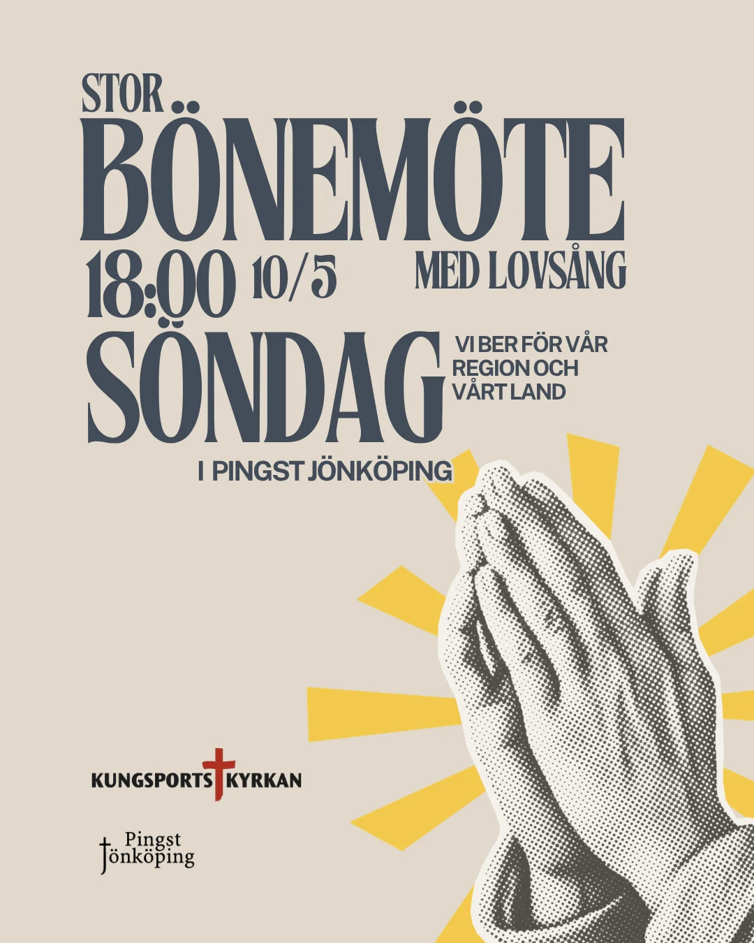 STORBÖNEMÖTE MED LOVSÅNG 🙏🎶 Pingst Jönköping tillsammans med Kungsporten och andra kyrkor 🗓 Söndag 10 maj 🕕 18.00 📍 Pingst Jönköping Vi ber